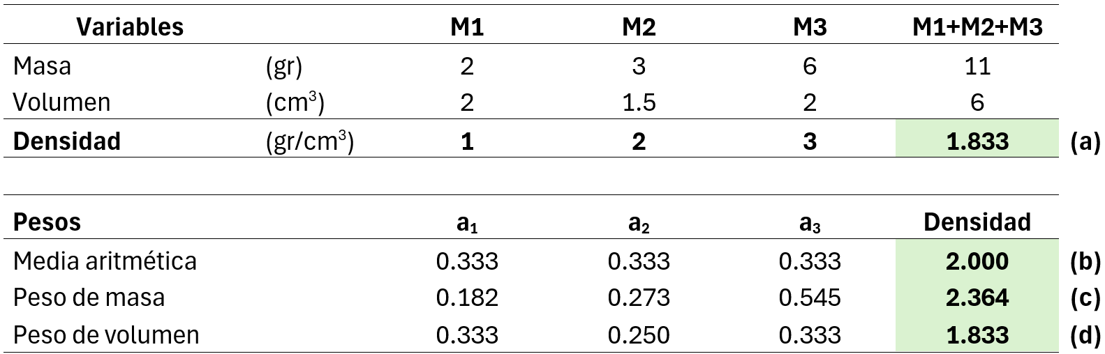 - Sumar las densidades de las muestras con pesos obtenidos al ponderar los volúmenes de las muestras, ai= Vi /VT , donde Vi son los volúmenes de las muestras y VT es el total del volumen. En este caso (d)=(a).