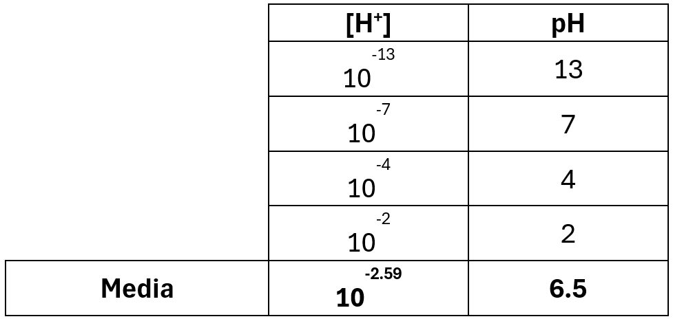 Veamos este concepto con el ejemplo de la variable pH. En la Tabla 2, se encuentra la variable pH, que se define como pH=-Log10[H+], si obtenemos la media directamente de la definición de pH el resultado es 6.5, sin embargo, si lo obtenemos a partir de la concentración el pH es 2.59. Este ejemplo nos muestra que no se puede obtener promedios a partir de funciones no lineales, por lo que se debe acudir a las definiciones para obtener los resultados correctos. En particular, aquí el promedio ponderado lo obtenemos directamente de la concentración transformando luego la concentración a pH.