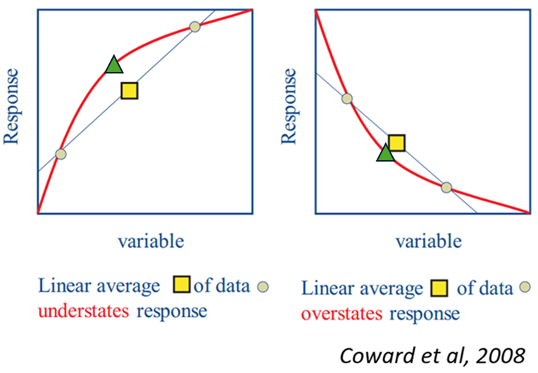 En la Figura 2, se muestra el efecto de calcular la variable de respuesta (cuadrado) a partir de dos muestras (círculos) como no es lineal, el resultado de calcular la mezcla de ambas muestras no se condice con la respuesta de esta (triángulo). Más adelante, revisaremos este problema con la variable work index.