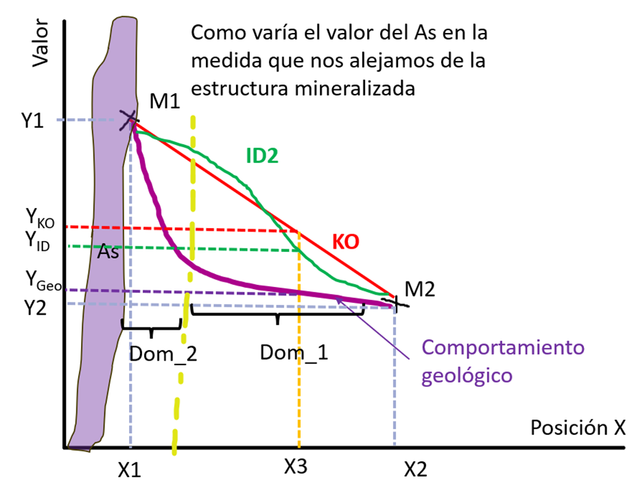 Ahora vamos a revisar el comportamiento espacial de una variable ubicada en diferentes dominios. En el siguiente ejemplo, se muestra cómo se comporta el arsénico (As) cuando nos alejamos de una veta mineralizada de enargita (Cu₃AsS₄), tenemos dos muestras (M1 y M2) con As y queremos determinar la ley (Y) en X3 (Figura 3). En la recta roja, se encuentra la estimación de kriging ordinario (KO) que es una función lineal; en verde, está la estimación del inverso de la distancia al cuadrado (ID2) que es una función no lineal; y la línea morada es el comportamiento real del arsénico.