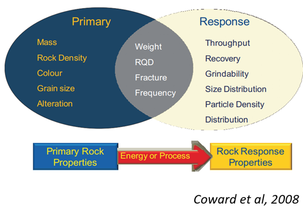 Existen otras propiedades de las variables en áreas como geotecnia o metalurgia que se pueden clasificar como primaria o de respuesta. Se entiende como propiedad primaria si representa una característica intrínseca del material de estudio y propiedad de respuesta si representa una característica de respuesta del material de estudio a algún proceso. Entre ambas clasificaciones se encuentran propiedades intermedias (ver Figura 1).