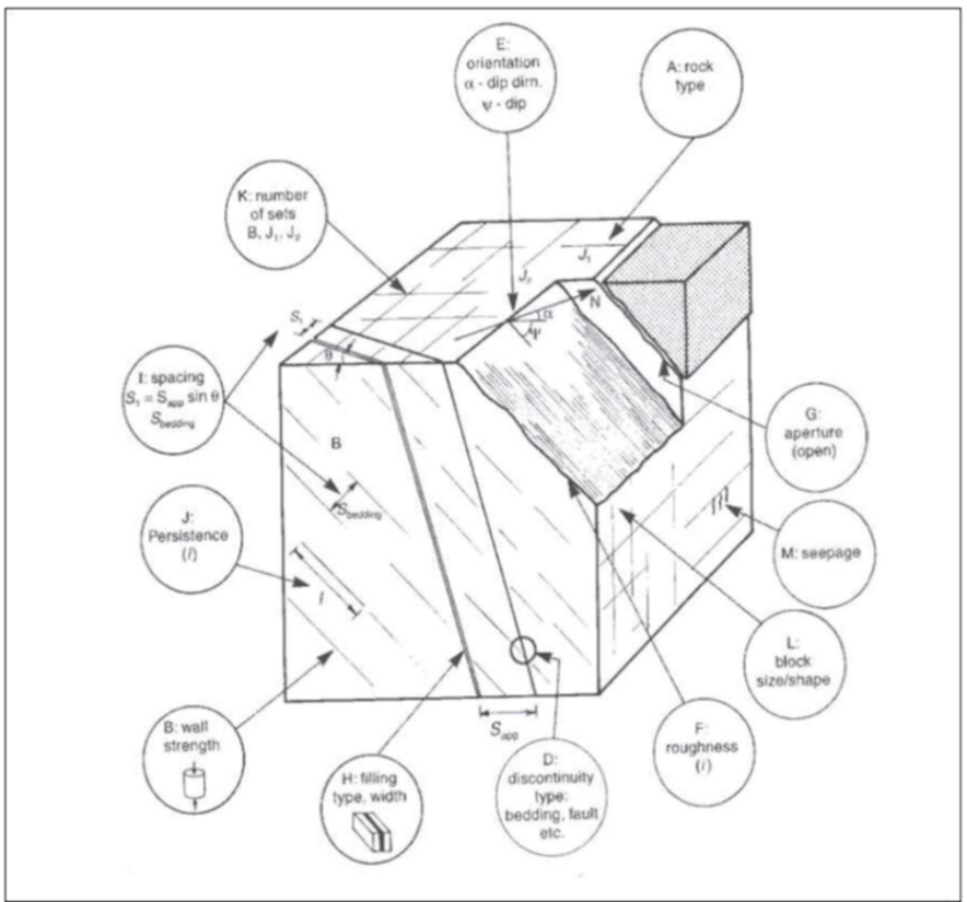 Para describir una zona, es necesario utilizar indicadores que den cuenta tanto de las propiedades de la roca intacta como del macizo rocoso. La Figura 1 presenta las variables de un macizo rocoso que están contenidas en la variable denominada Rock Mass Rating (RMR) desarrollada por Z.T. Bieniawski entre los años 1972 y 1973, actualizada posteriormente.