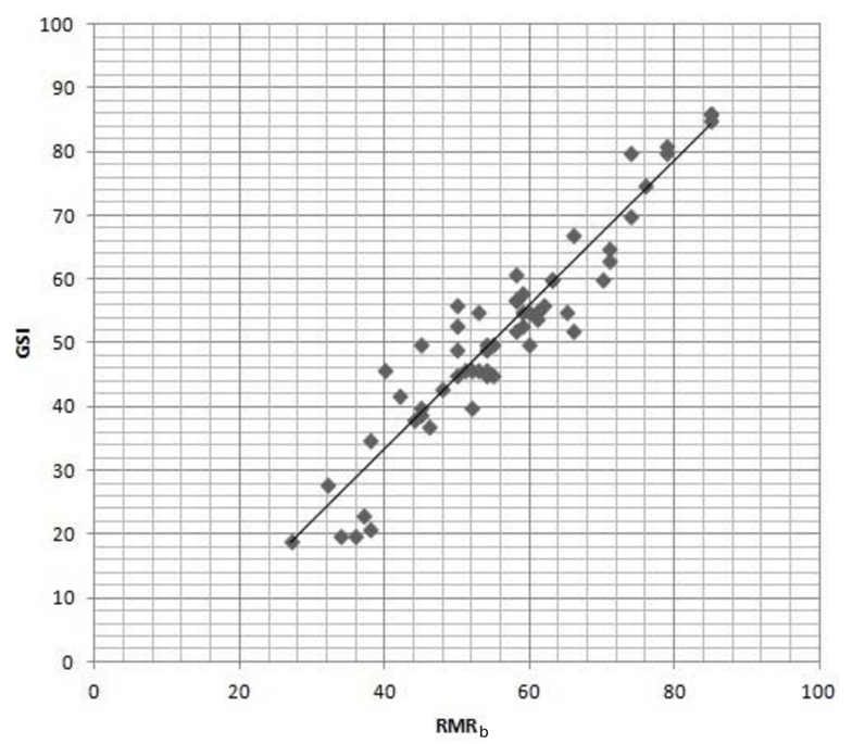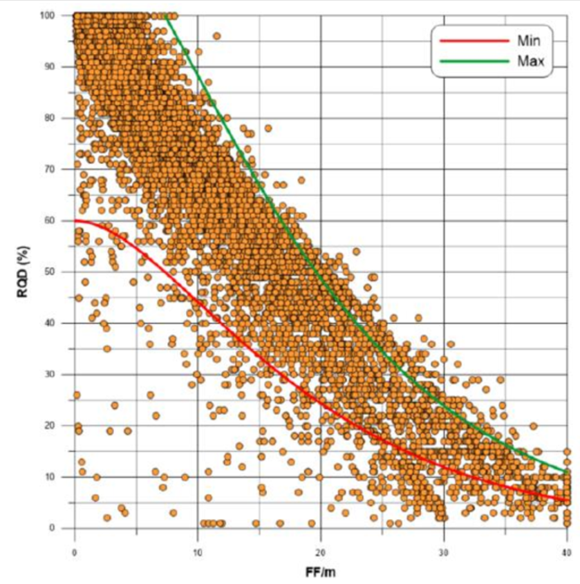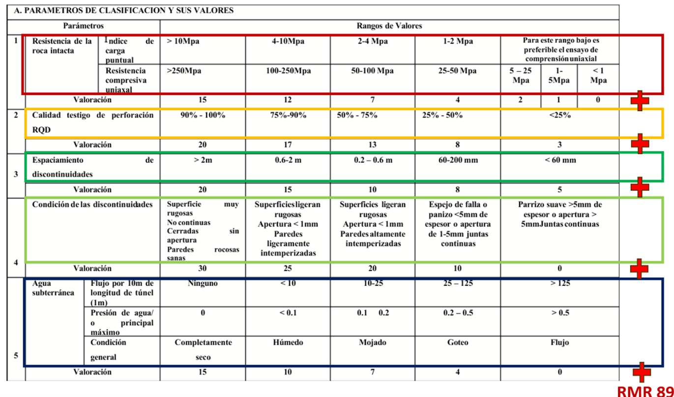 En la Tabla 1, se muestra la composición de la variable RMR, que corresponde a la sumatoria de variables parciales que permiten calcular la variable RMR; para ello, se suma la valoración de cada box coloreado. Por ejemplo, si el RQD de la muestra es 65 %, la valoración asignada es 13; se realiza este cálculo para cada una de las variables que componen el RMR. Si observamos la valoración asignada a cada tramo de la variable RQD, no se relaciona en forma lineal respecto de los valores medidos de esta variable, esto tiene como consecuencia que la variable RMR sea “no aditiva” y no lineal por lo que no se puede estimar directamente. La recomendación es estimar cada variable por separado y calcular posteriormente su valoración. Se debe considerar que variables como RQD, FF y resistencia de la roca intacta son variables direccionales por lo que no son aditivas, pero se pueden estimar bajo ciertas condiciones.