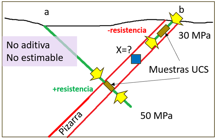 Otro caso es la variable resistencia de la roca intacta, al medir, por ejemplo, la variable UCS (Uniaxial Compressive Strength) en una roca metamórfica (pizarra) como muestra la Figura 3, por el hecho de ser medidos en diferentes direcciones, sus valores serán diferentes, debido a que las medidas realizadas paralelas al eje máximo de deformación son más bajas que las realizadas perpendiculares a estas. Esta variable presenta variaciones direccionales que están relacionadas con los elipsoides de deformación en las rocas metamórficas, pero si las medidas son realizadas en rocas intrusivas, podemos asumir un comportamiento isotrópico, además de asumir aditividad en los diferentes dominios litológicos; por lo tanto, podemos realizar estimaciones de estas variables en cada dominio. El contexto geológico permite simplificar el problema de este tipo de variables.
