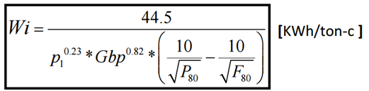 Ahora analizaremos la variable de respuesta Work Index (Wi), definida como el índice de trabajo que requiere la potencia necesaria para moler un material desde un tamaño teóricamente infinito hasta uno tal que pase el 80% de los 100 micrones, permitiendo así obtener una buena estimación de la energía necesaria para la molienda (kWh/tc). Para calcular el índice Wi, deben obtenerse datos experimentales bajo estrictas condiciones de operación.