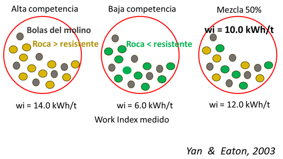 Yan & Eaton (2003) estudiaron el comportamiento del índice de Bond en mezclas físicas de mineral de alta (Wi = 14.0 kWh/t) y baja competencia (Wi = 6.0 kWh/t). Consideraron que la mezcla debería corresponder al promedio aritmético de los valores ingresados (Wi = 10.0 kWh/t). Sin embargo, la mezcla física probada en laboratorio arrojó un valor de 12,23 kWh/t (Figura 6).