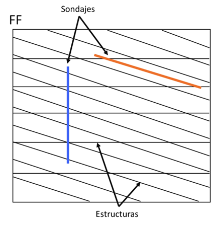 En la Figura 2 , las líneas rojas y azules representan soportes de un metro de largo; es fácil verificar que, en la dirección vertical (de color azul), FF = 9 [fracturas/m]; mientras que para el sondaje inclinado (de color rojo), FF = 2 [fracturas/m]. Este simple ejemplo muestra la enorme dependencia de la dirección que puede tener la variable.