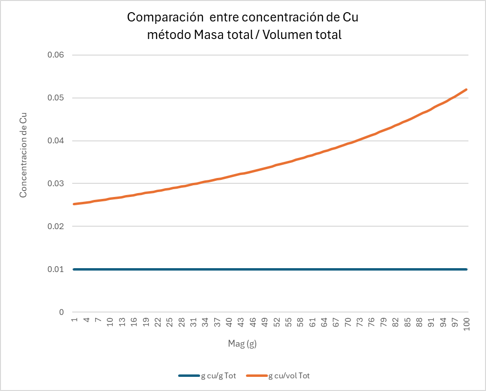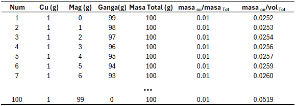 Para visualizar gráficamente la relación entre las variables de concentración definidas en el espacio de masa total y en el espacio volumétrico, se elaboró la Tabla 3 a partir de las definiciones previas. Esta tabla contiene 100 muestras cuya masa total es siempre de 100 g. Cada muestra está compuesta por Cu, magnetita (Mag) y ganga. El contenido de Cu es constante en todas las muestras (1 g), mientras que la cantidad de magnetita aumenta progresivamente de 0 g a 99 g, reduciéndose en la misma proporción la ganga.
