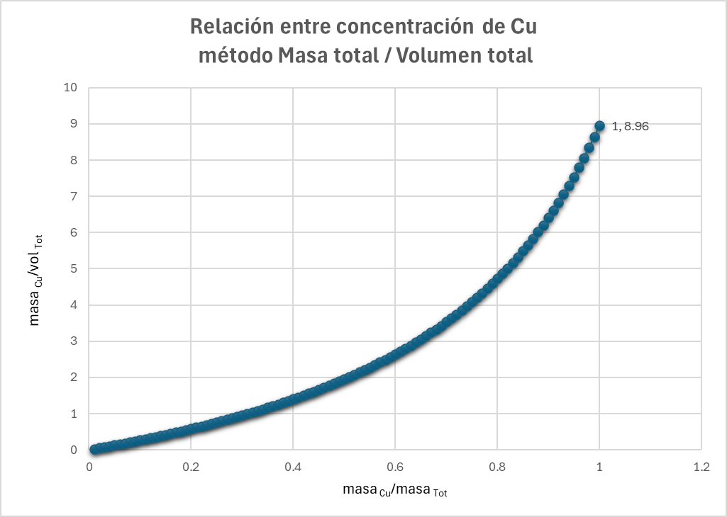 En el gráfico siguiente (Figura 2), generado a partir de una tabla similar a la anterior pero compuesta únicamente por Cu y ganga, se incrementa progresivamente el contenido de Cu y se representan dos variables: la concentración de Cu definida en el espacio volumétrico y la definida en el espacio de masa total. El resultado muestra que la relación entre ambas variables es no lineal.