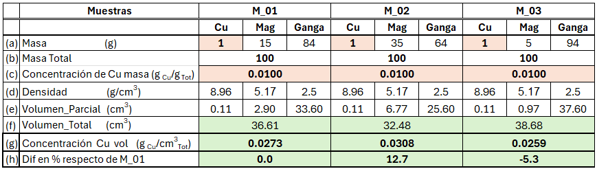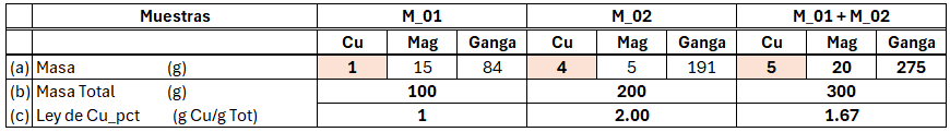 Concentración (X) % =100* (masa)X/(masa)Tot, esto es la cantidad en gramos del elemento de interés (X) con respecto de la masa total de la muestra ((masa)Tot) multiplicado por 100 para obtener la concentración en %. La Tabla 1 presenta dos muestras para determinar su aditividad, se separa entres3 componentes para entender, posteriormente, el efecto de la densidad. La muestra M_01 pesa 100 gramos (ver fila b), con 1 gramo de Cu (ver fila a), 15 gramos de Mag y 84 gramos de ganga, obteniendo como resultado 1% de Cu (ver fila c) para la muestra M_02 se obtiene 2% de Cu. En la última columna se mezclan ambas muestras y aplicando la definición se obtiene una ley de 1.67 % de Cu.